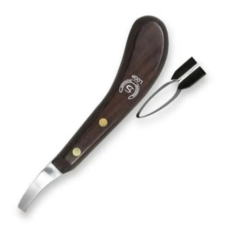 Копитний ніж Double S Loop Knife складається з довгої ергономічної дерев’яної ручки та леза з вуглецевої сталі для більшої міцності