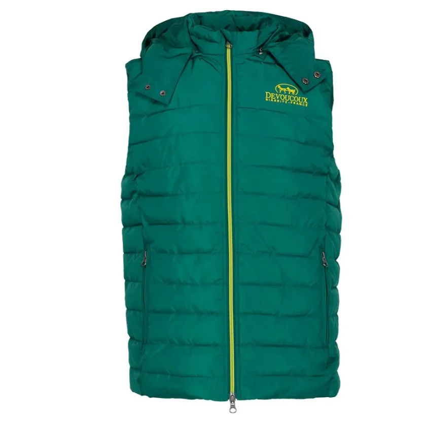 Чоловічий стьобаний пуховий жилет від Devoucoux зі знімним капюшоном і з застібкою з двома бігунками, що дозволяє адаптуватися до будь-яких обставин.